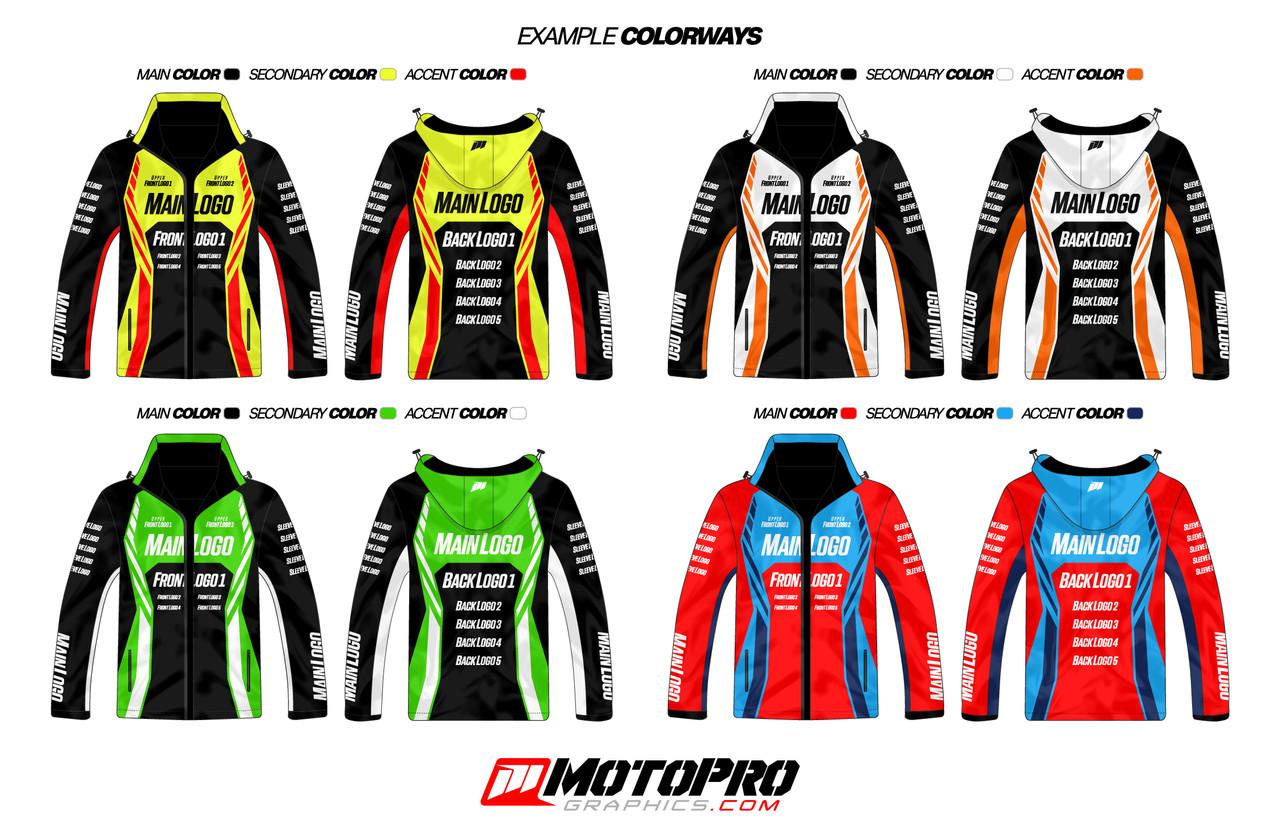 Our custom jackets are created using sublimation printing, allowing for maximum customization featuring your choice of colors and sponsors or business logos. Perfect for race teams and personnel.